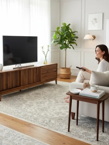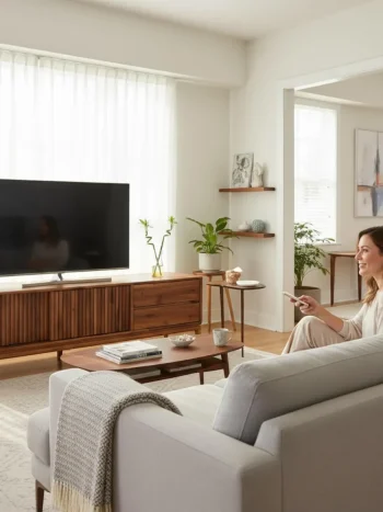 - Mid-Century Modern Konsol & TV Ünitesi – Çıtalı Kapaklı Medya Ünitesi