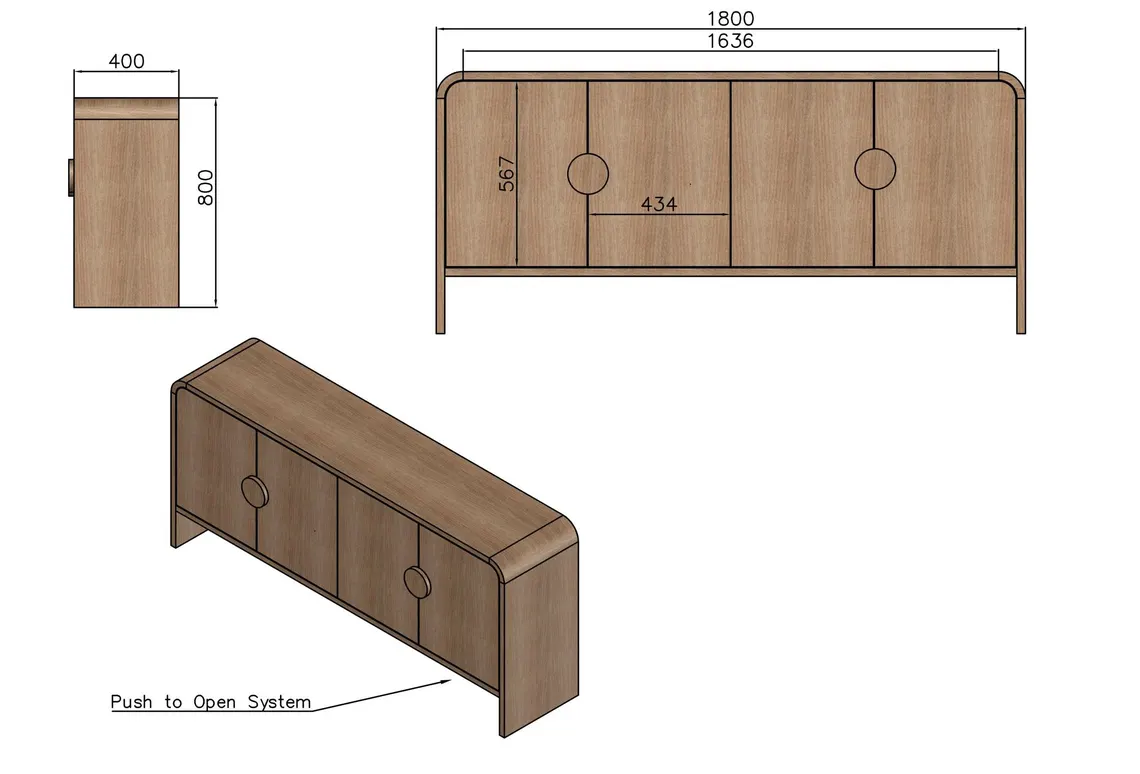 Geniş üst tabla, televizyon, ses sistemi ve dekoratif objeler için ideal bir alan yaratır. 180 cm genişlik, 40 cm derinlik ve 80 cm yükseklik ölçüleriyle, özellikle büyük ekran TV’ler için dengeli bir konumlandırma imkânı sunar. Ön yüzünde yer alan 4 adet push-to-open kapak, kulpsuz sade bir görünüm oluştururken pratik kullanım sağlar. İç bölümdeki iki geniş hazne ve ayarlanabilir raflar sayesinde kitap, medya ekipmanları, oyun konsolları veya servis takımlarınızı düzenli şekilde saklayabilirsiniz.