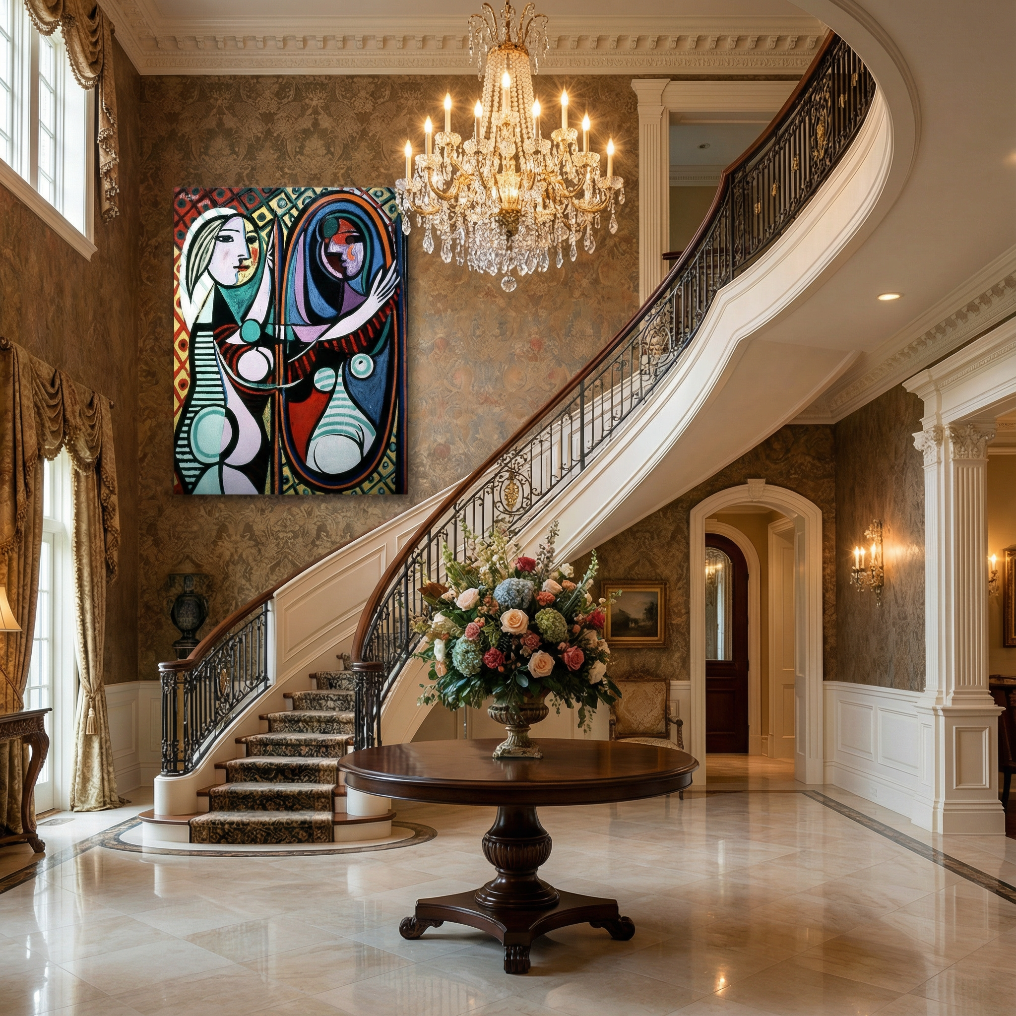 Picasso’nun en ikonik ve en çok aranan eserlerinden Ayna Karşısındaki Kız (Girl before a Mirror), canlı renkleri ve kübist form diliyle bulunduğu ortamın enerjisini anında yükseltir. Yüzün ve bedenin aynadaki yansıması üzerinden “kimlik, duygu ve dönüşüm” temasını güçlü biçimde anlatan bu eser, modern dekorasyonda odak duvarı oluşturmak isteyenler için harika bir kanvas tablo seçeneğidir.