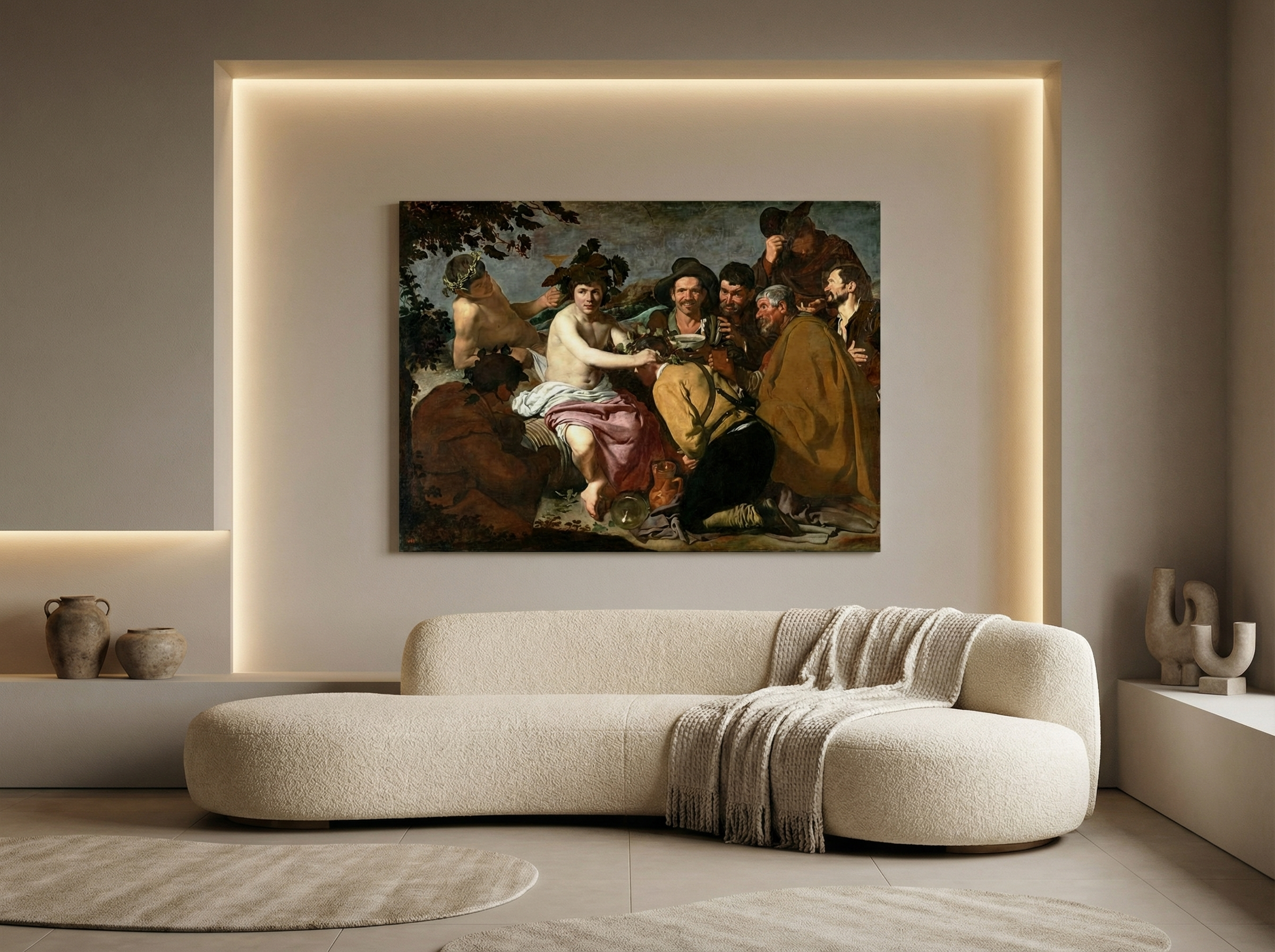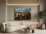 Baküs’ün Zaferi (Sarhoşlar), mitolojinin coşkusunu, eğlenceyi ve hayatın taşkın enerjisini sahneye taşıyan etkileyici bir kompozisyondur. Şarap, müzik ve kutlama atmosferi; yalnızca bir “şenlik” anlatısı değil, aynı zamanda haz, özgürlük ve insan doğasının dürtüsel yönleri üzerine güçlü bir görsel hikâyedir. Bu kanvas tablo, mekâna hareket, canlılık ve karakter katar; özellikle geniş duvarlarda “konuşturan” bir odak noktası oluşturur.