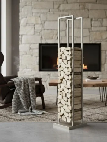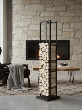 Bu sayede hem küçük yaşam alanlarına hem de geniş şömine duvarlarına uygun bir metal odunluk seçebilirsiniz. Siyah gövde, ceviz, meşe ve gürgen tonlarındaki mobilyalarla uyumlu bir kontrast oluşturarak sıcak ve şık bir atmosfer yaratır.