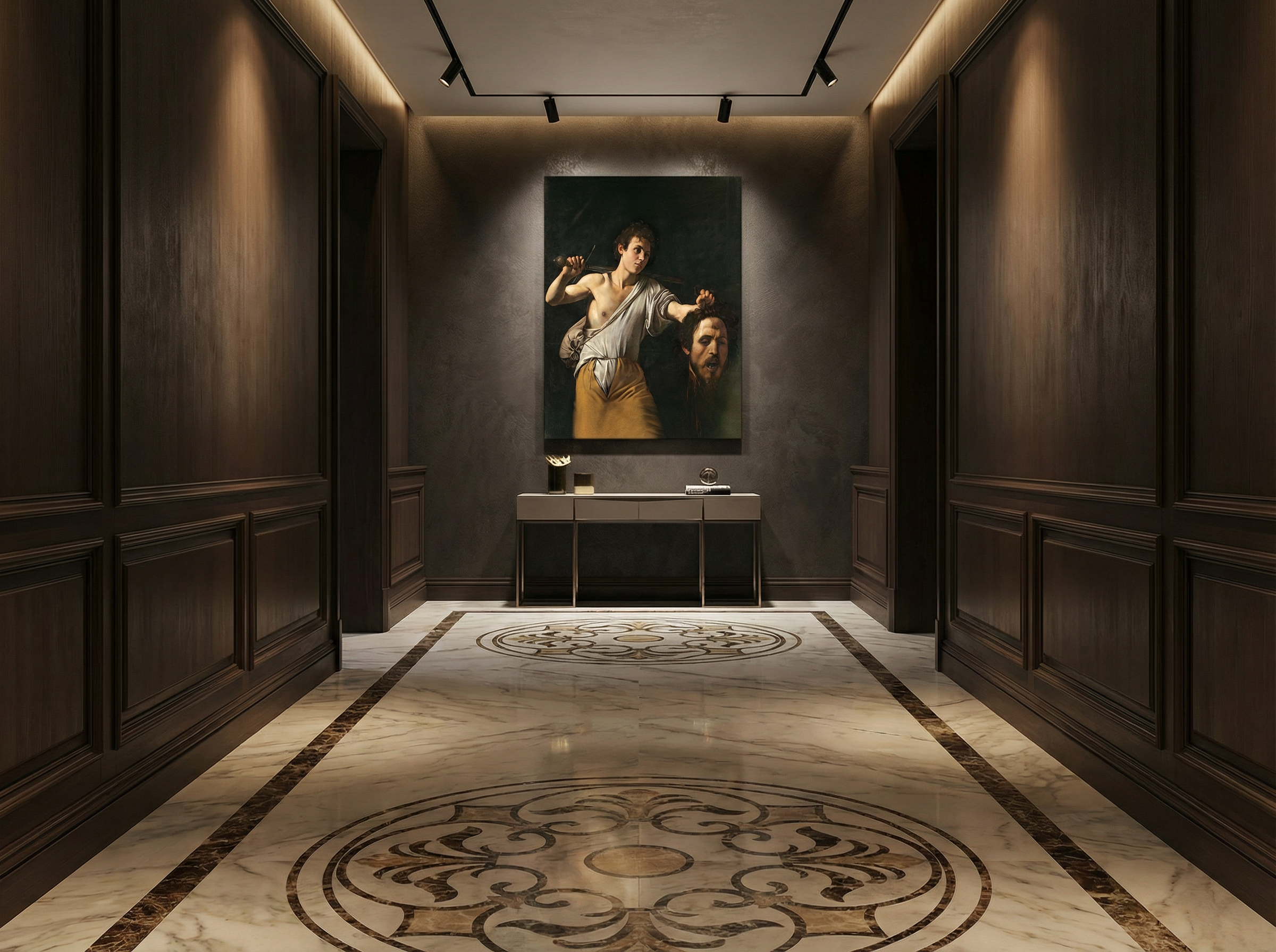 Davut ve Golyat’ın Başı, Barok sanatın en karanlık, en içsel ve en çarpıcı eserlerinden biridir. Zafer anı coşku ile değil; pişmanlık, merhamet ve insanlık hâli üzerinden anlatılır. Davut’un yüzündeki ifade, gücün değil; vicdanın ve fark edişin ön planda olduğunu gösterir. Bu kanvas tablo, mekâna derin bir dramatik etki ve güçlü bir sanatsal karakter kazandırır.