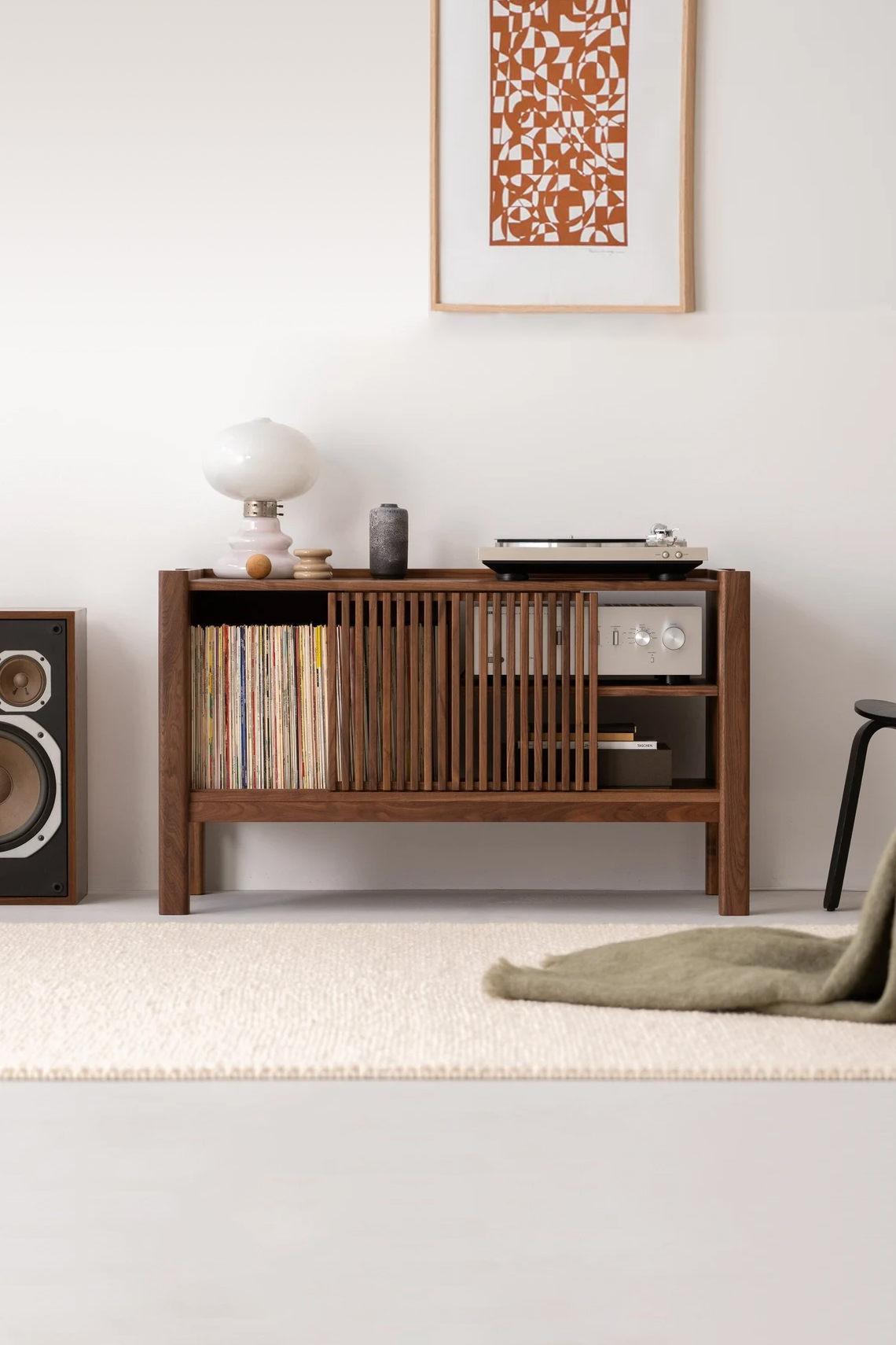Kompakt ölçüleri, masif ceviz gövdesi, sürgülü şerit kapakları ve düşünülmüş kablo düzeniyle, yıllar boyunca keyifle kullanacağın zamansız bir plak çalar konsolu.