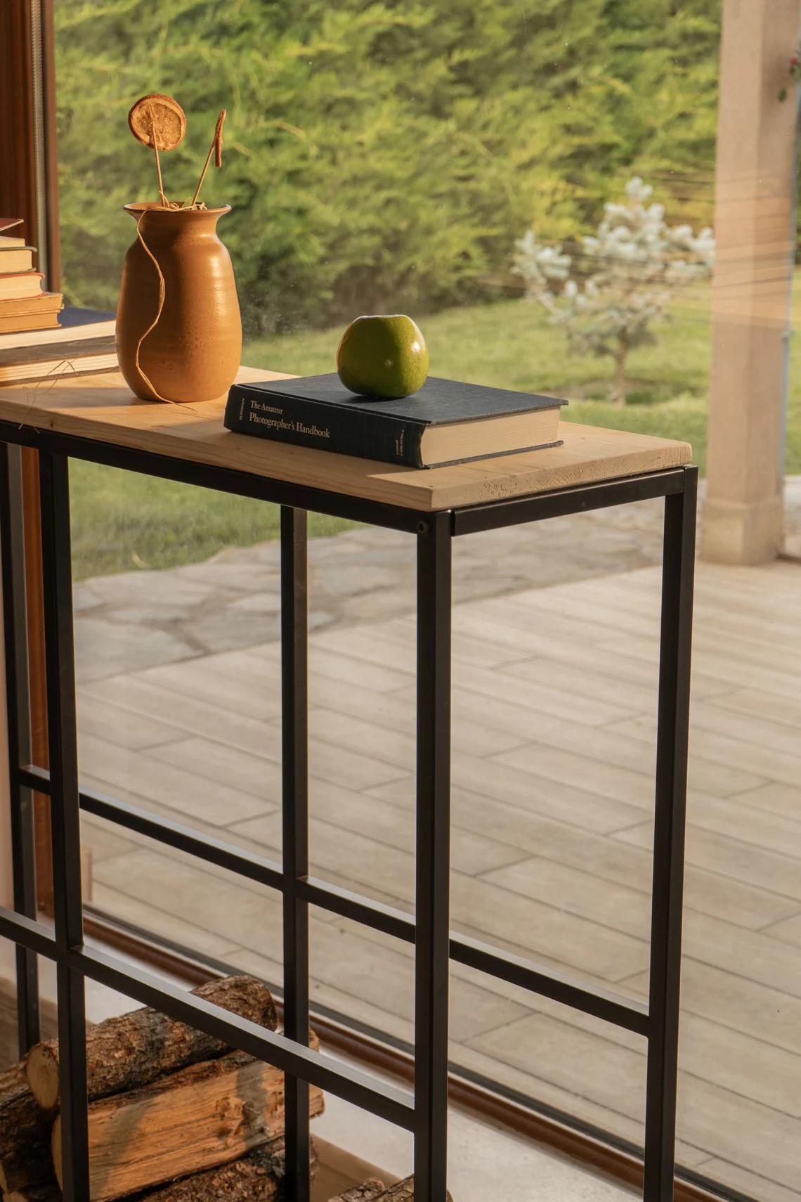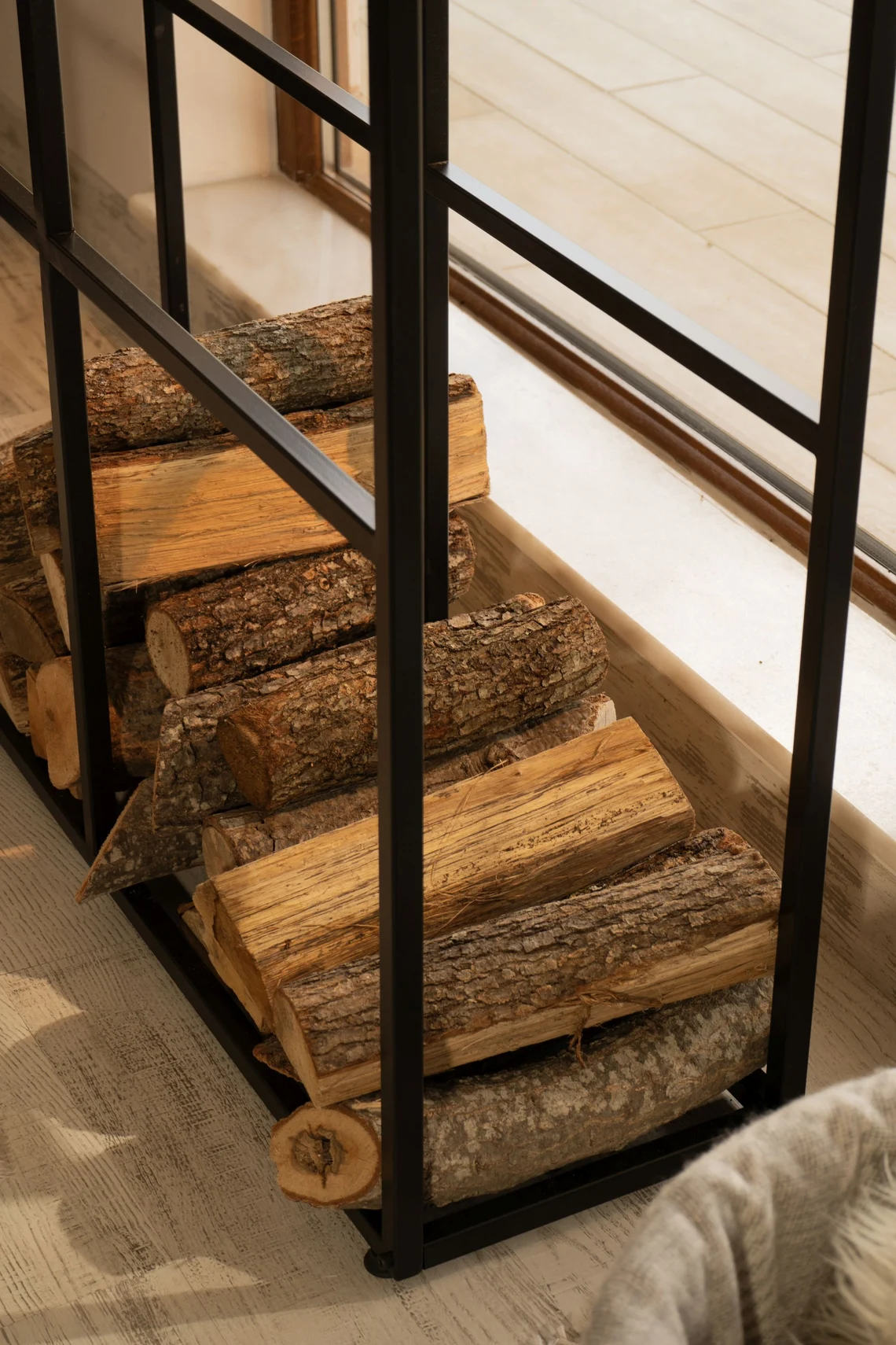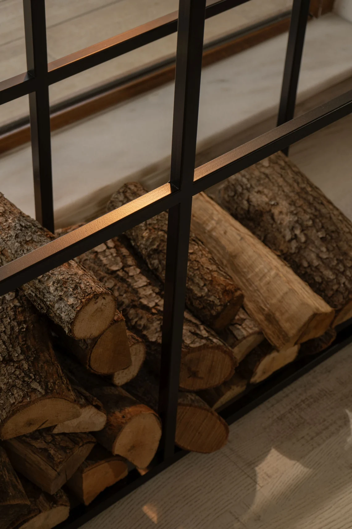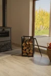 Ön yüzü dört ayrı bölmeye sahip olan metal odunluk, farklı boyuttaki odunları düzenli şekilde ayırmanıza imkân tanır. Böylece ince tutuşturmalık, orta ve kalın kütükleri ayrı ayrı istifleyip hem görsel hem de kullanım açısından pratik bir düzen elde edersiniz. Üst kısımda yer alan masif ladin ağacından üretilmiş doğal ahşap tabla; mumluk, vazo, çerçeve veya küçük dekor objeleri sergilemeniz için ideal bir yüzey oluşturur. Standart olarak doğal vernikli ahşap ile sunulur; isterseniz ceviz tonuna boyanmış üst tabla talep edebilirsiniz.