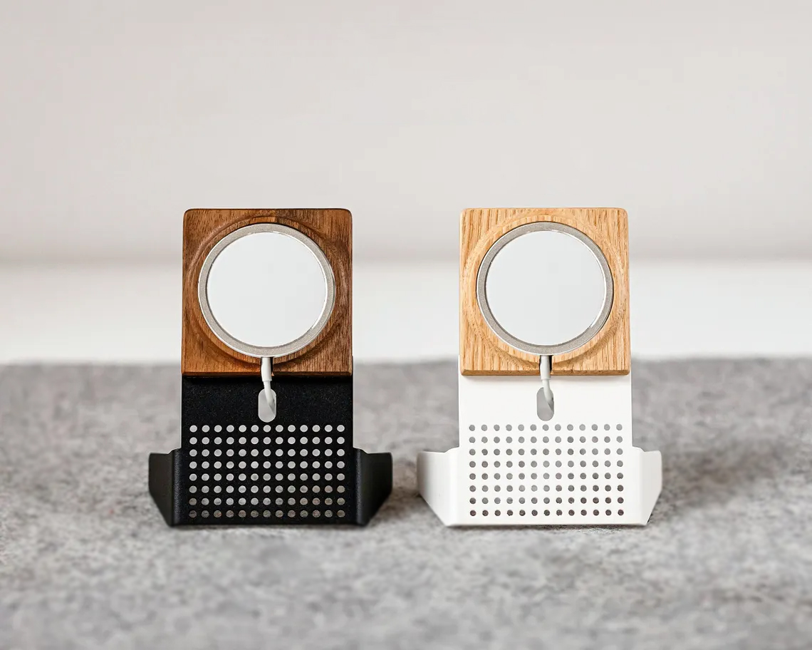 El yapımı üretim süreci sayesinde her parça kendine özgü bir dokuya sahiptir. iPhone ve Apple Watch’u aynı anda şarj edebilmenizi sağlayan eğimli yapı, hem ergonomik hem de estetik bir kullanım sunar.
