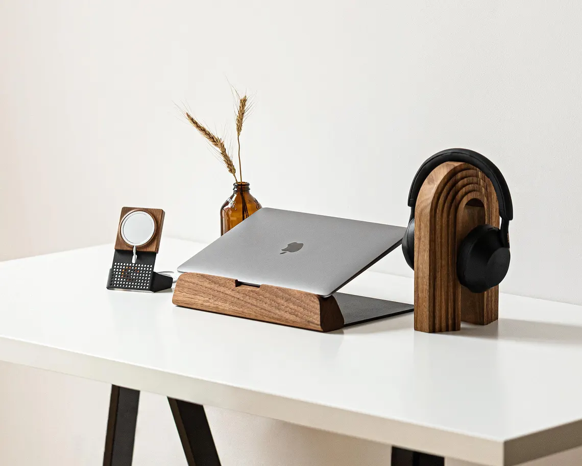 Masaüstünde kablo karmaşasından hoşlanmayanlar için tasarlanan bu ahşap kablosuz şarj istasyonu, sade ama karakterli bir görünüm arayan kullanıcıların beklentilerine hitap eder. Doğal ceviz, gürgen veya meşe ahşap seçenekleri; siyah ya da beyaz metal gövdeyle dengeli bir bütünlük oluşturur.