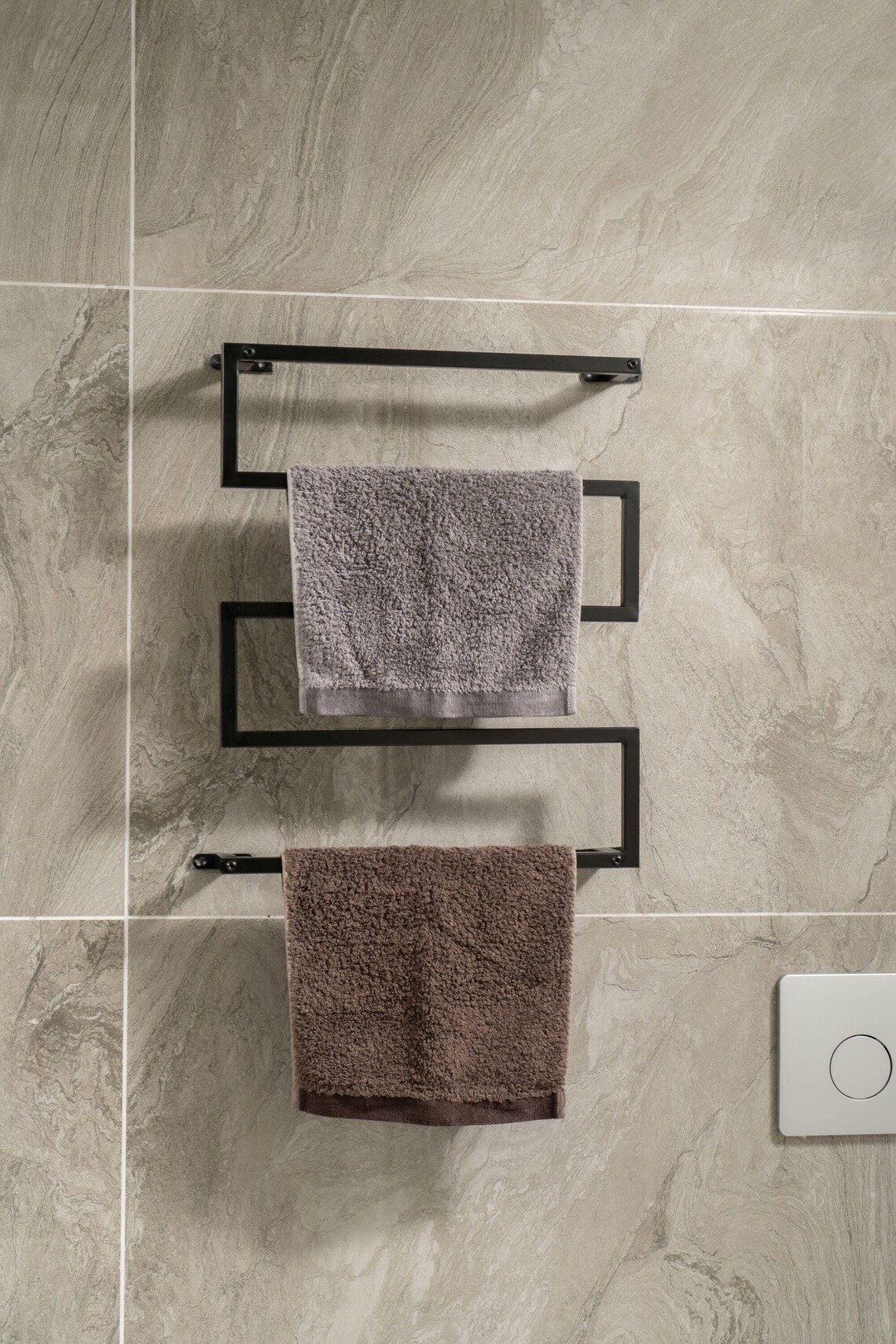 Bu modern metal raf, sadece banyolarda değil; mutfak, giyinme odası veya çamaşır odası gibi alanlarda da fonksiyonel bir yardımcı üründür. Askılara mutfak havluları, bornozlar veya giysiler asılabilir; üst alanı günlük ürünlerinizi organize etmek için kullanabilirsiniz.