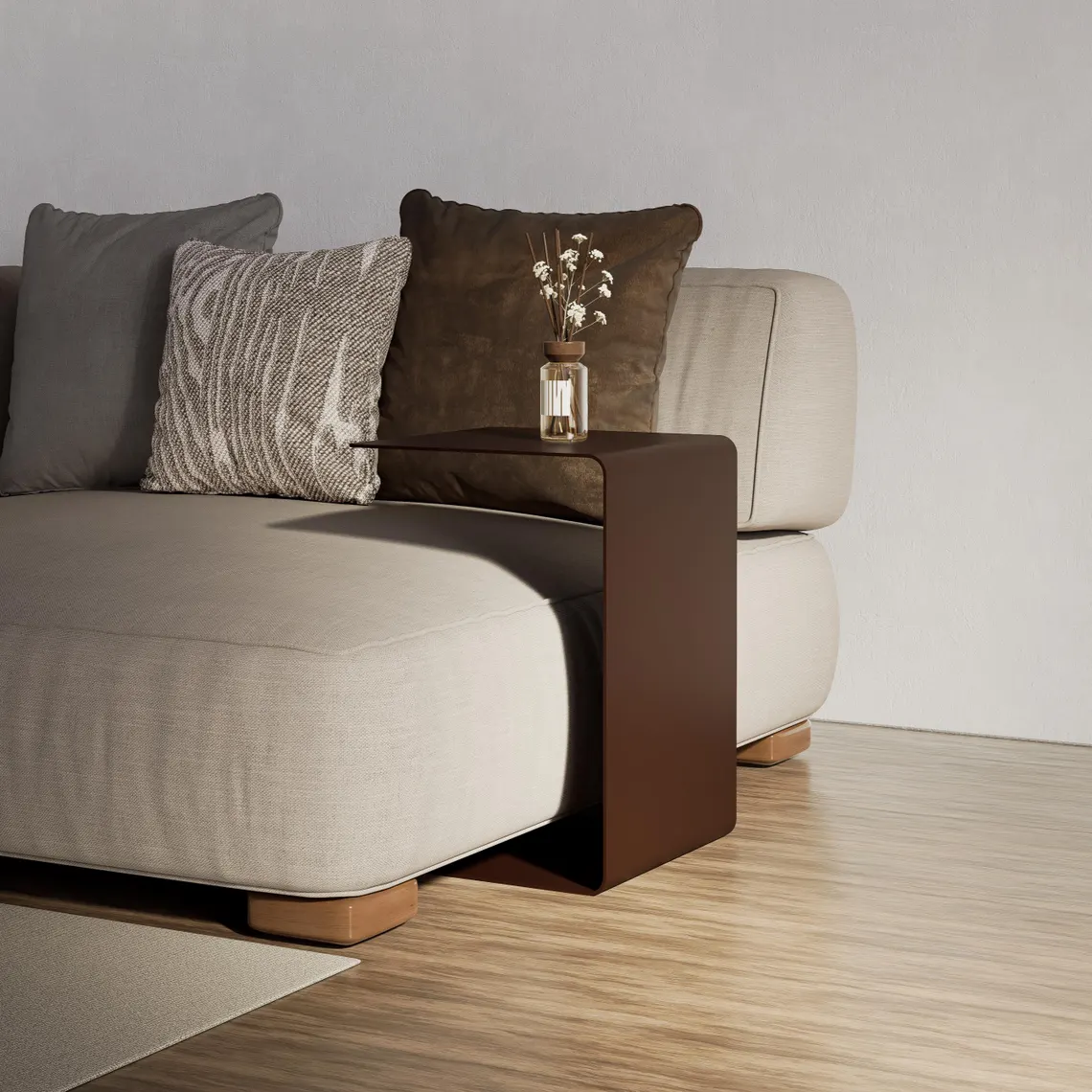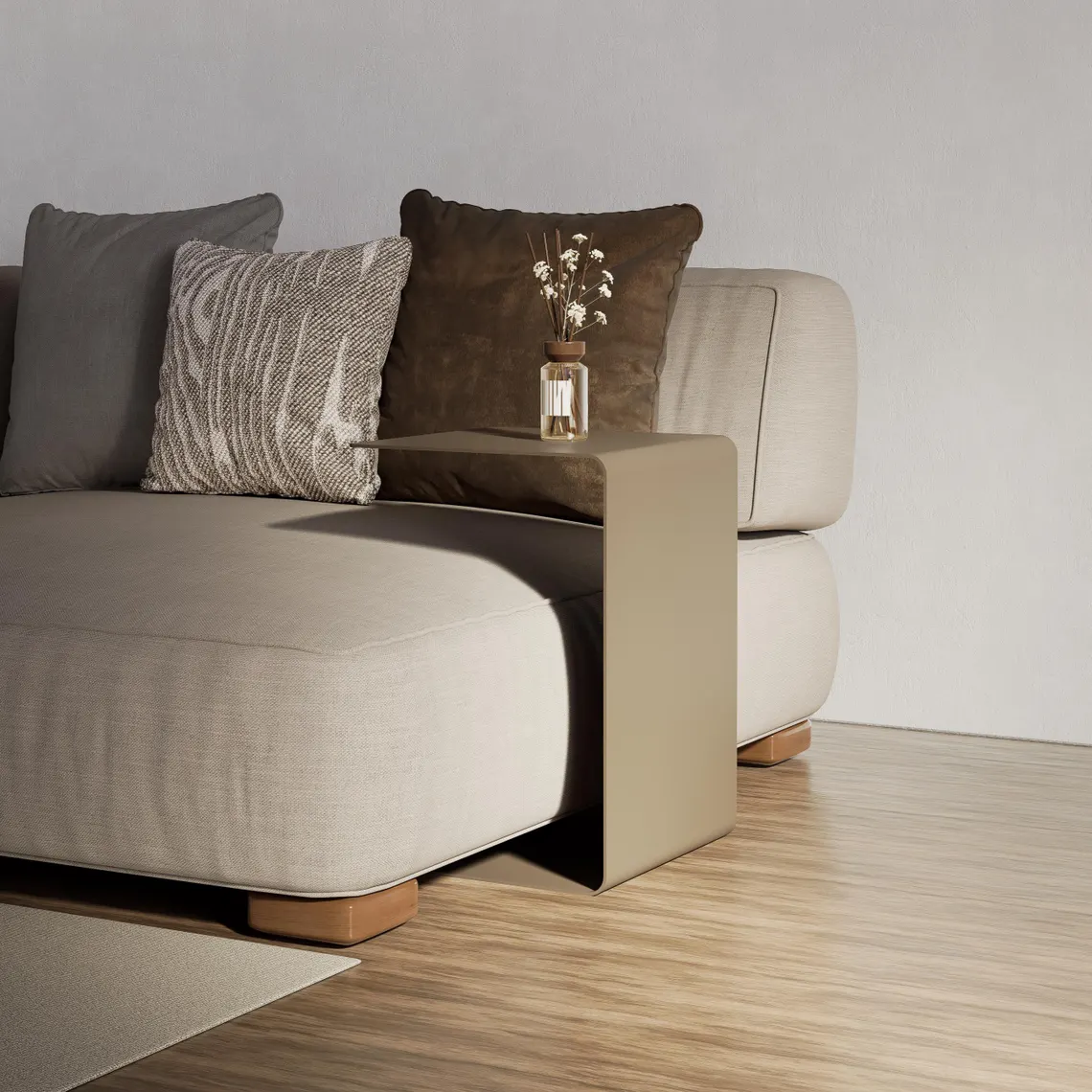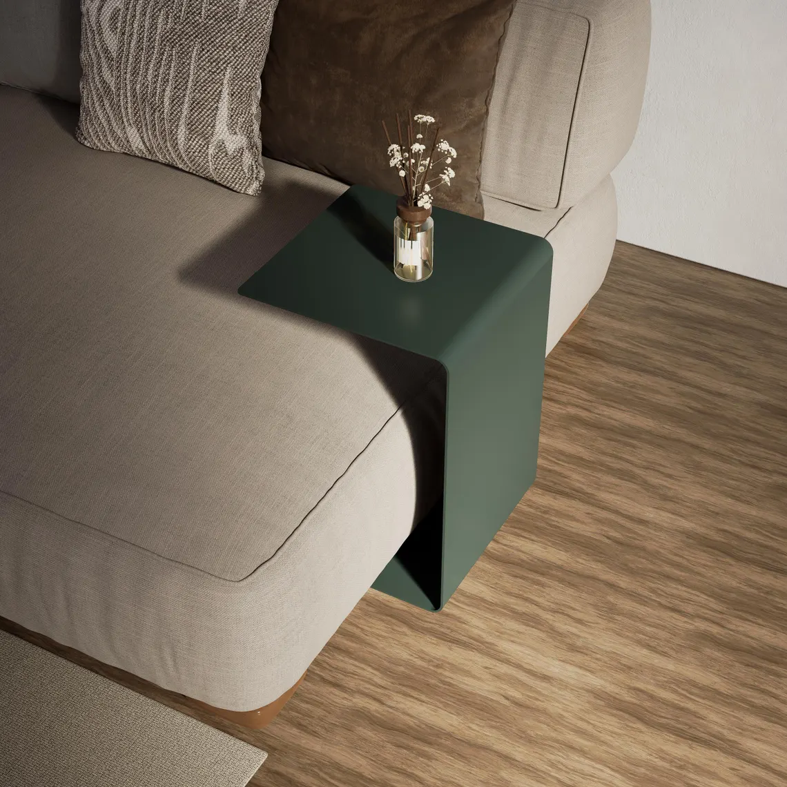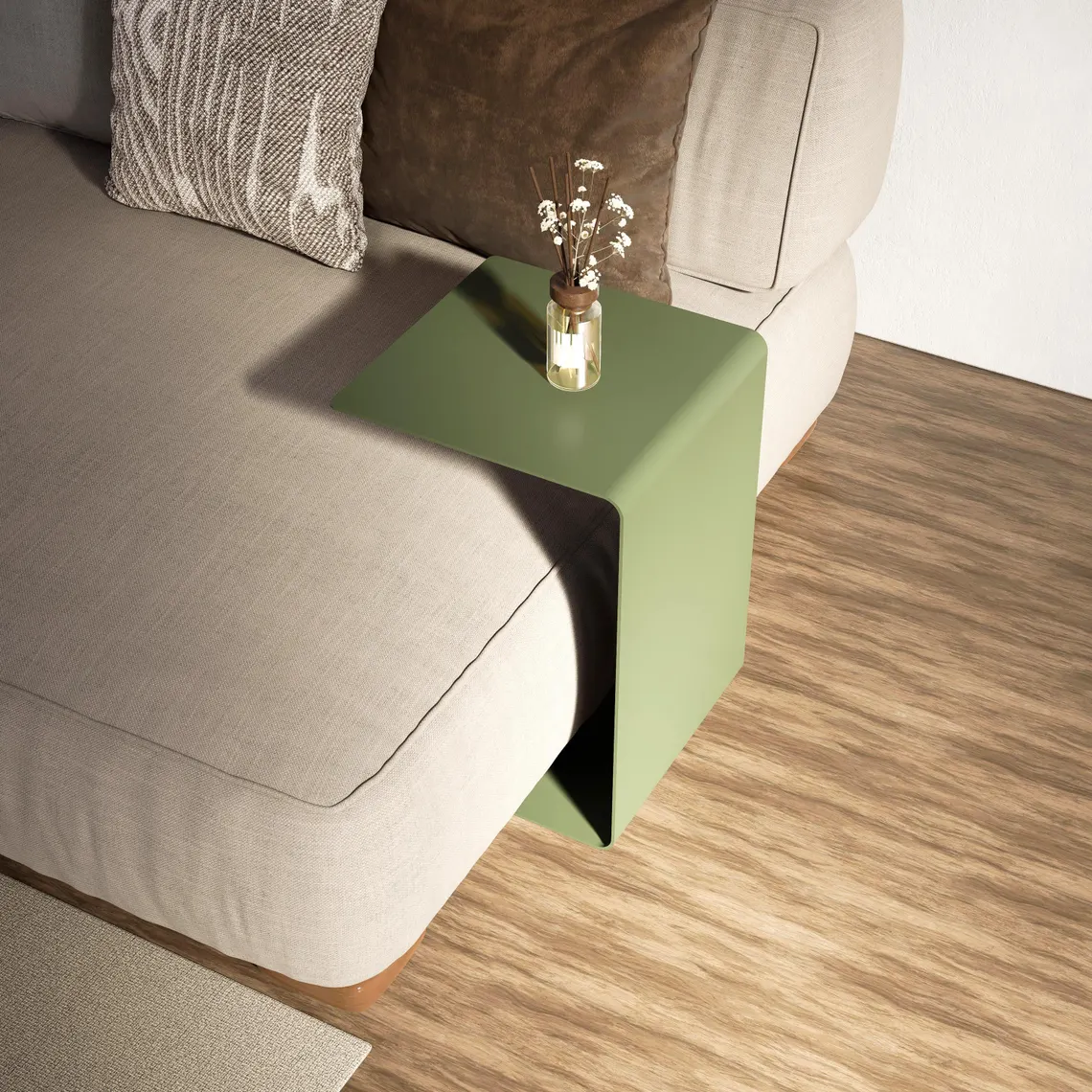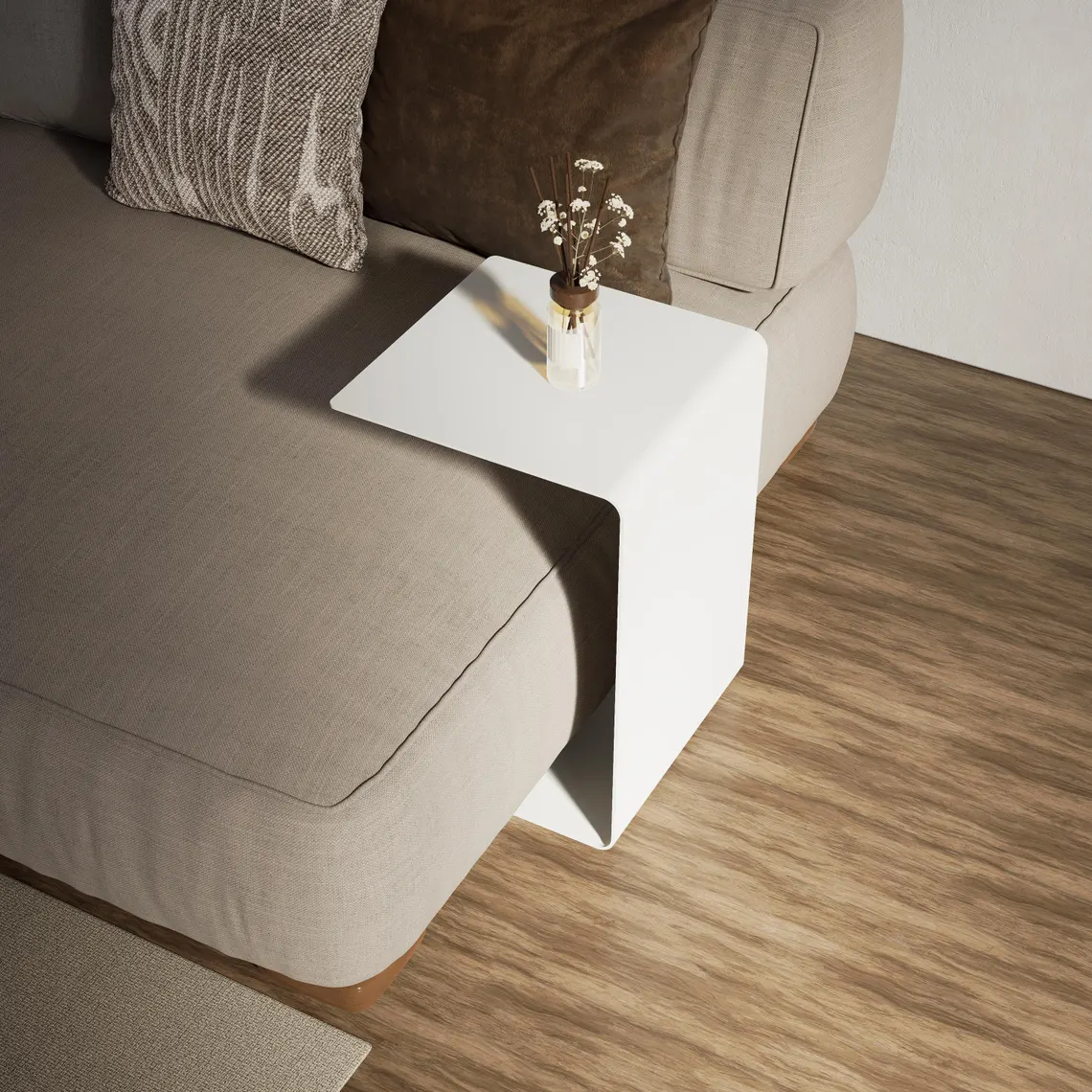 Modern yaşam alanları için tasarlanan bu minimalist metal sehpa, C formundaki ergonomik yapısıyla koltuk, kanepe ve berjerlerinizin altına kolayca girerek size pratik bir kullanım yüzeyi sunar. Küçük alanlarda bile fazla yer kaplamadan kahve fincanınızı, kitabınızı, bilgisayarınızı veya dekor objelerinizi konumlandırabileceğiniz kullanışlı bir yardımcı mobilyadır.
