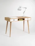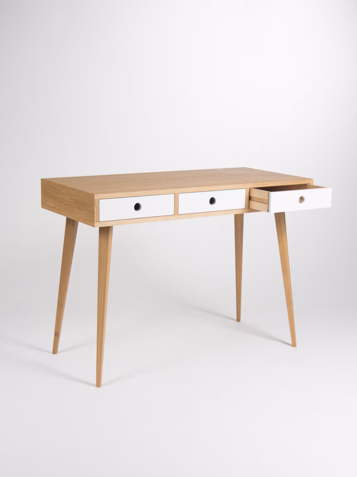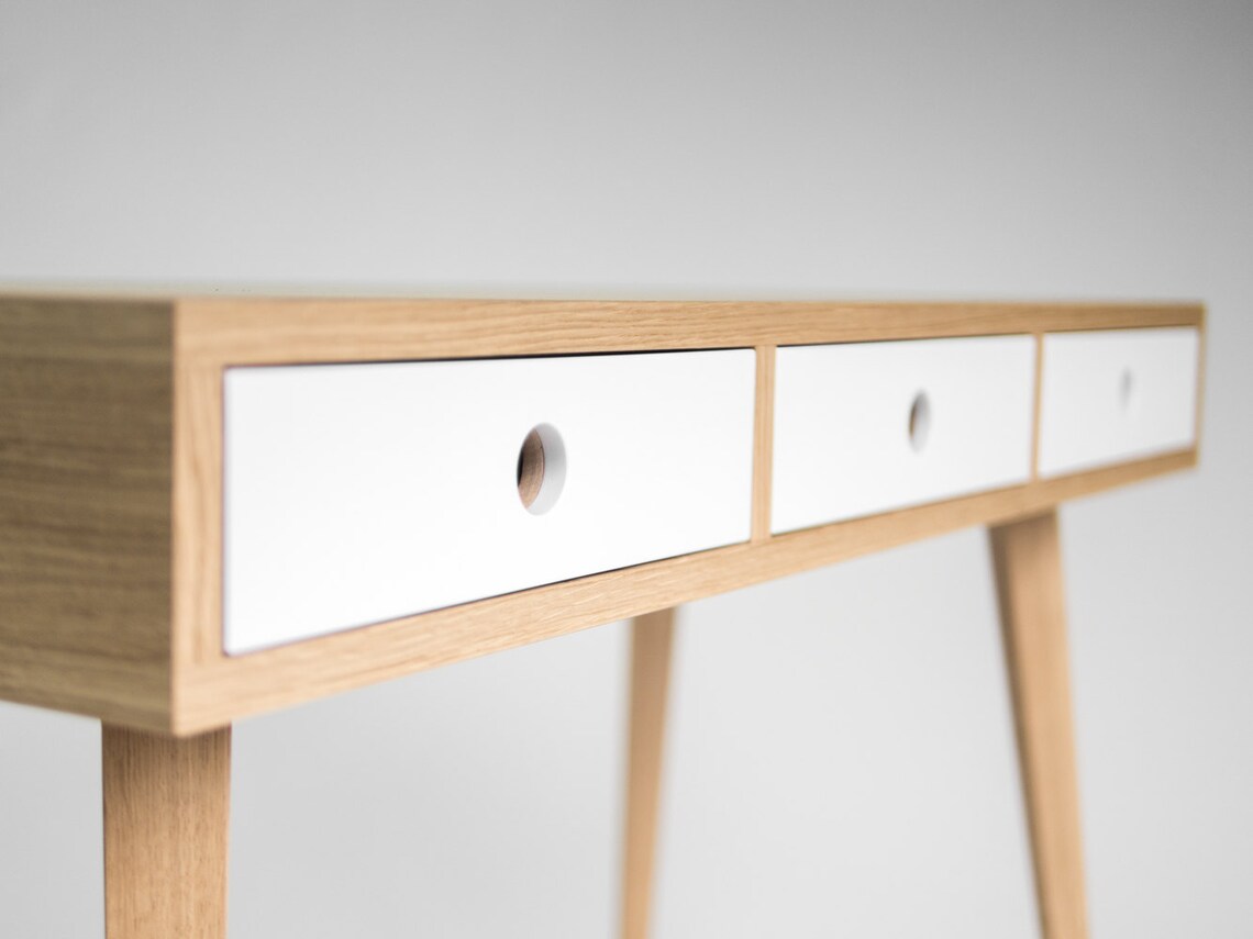 Üst gövdesi doğal meşe kaplama ahşap, ayakları ise masif meşe ağacından üretilen İskandinav çalışma masası, sert balmumu yağı ile cilalanarak uzun ömürlü ve dayanıklı hale getirilir. Üç adet beyaz mat ön panelli çekmecesi; defter, evrak, kalem ve küçük ofis aksesuarlarınızı gizli ve düzenli bir şekilde saklamanıza olanak tanır. Böylece çalışma yüzeyiniz daima ferah ve toplu görünür.