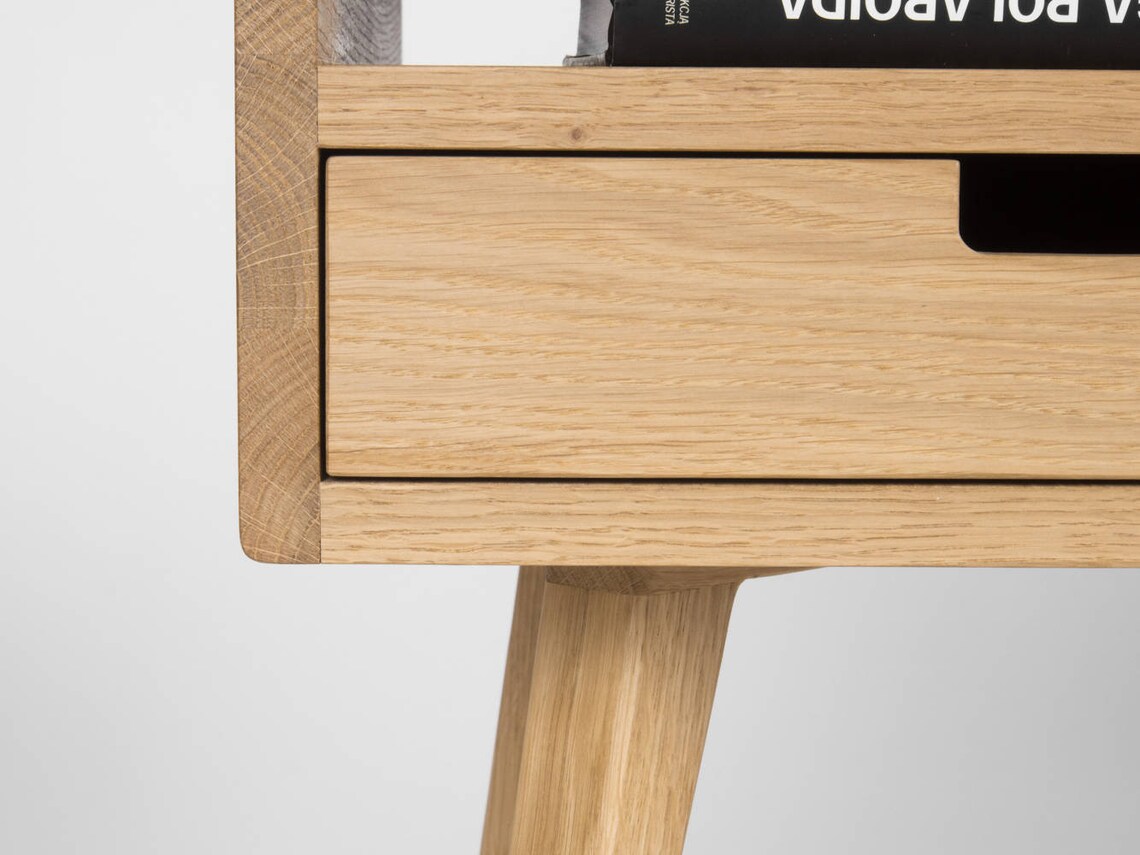Üst gövdenin üst ve alt yüzeylerinde doğal meşe kaplama, yan panellerde masif meşe ahşap kullanılır. Çekmece önü, masif meşe katmanla güçlendirilmiş; çekmece gövdelerinde ise dayanıklı huş kontrplak tercih edilmiştir. Masif meşe ayaklarla tamamlanan İskandinav komodin, doğal sert balmumu yağı ile cilalanarak ahşabın nefes almasını sağlar ve damar desenlerini ön plana çıkarır.