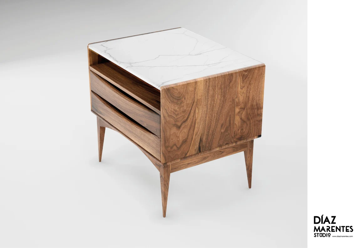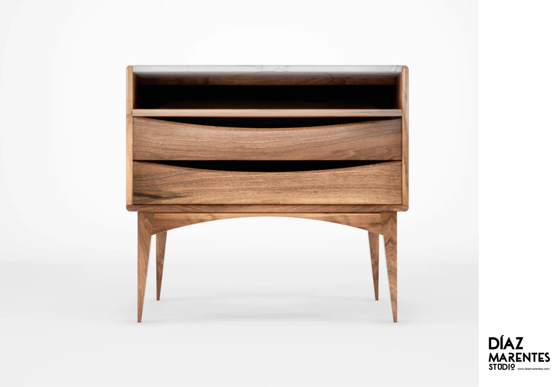 NordRest İskandinav komodin, eski ustaların el işçiliğinden ve orta yüzyıl modern tasarımından ilham alan, sade ama çok güçlü bir başucu mobilyasıdır. Minimal çizgiler, mermer üst tabla ve konik piramit formunda ayaklar, yatak odasına hem zarafet hem de karakter katar.