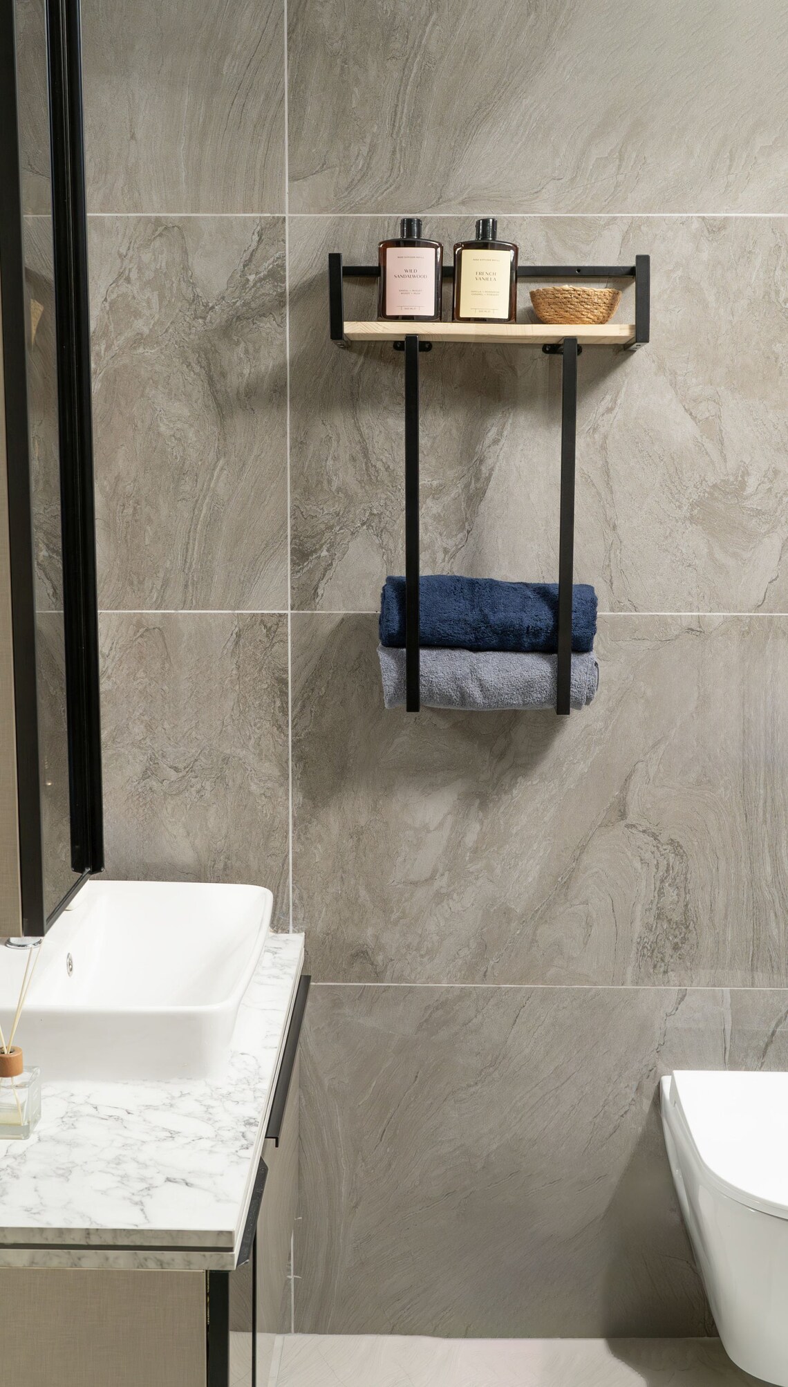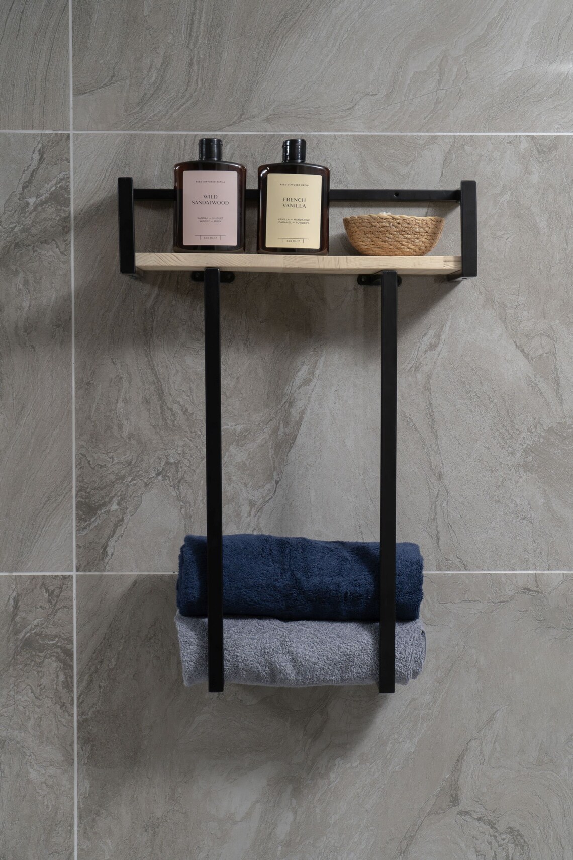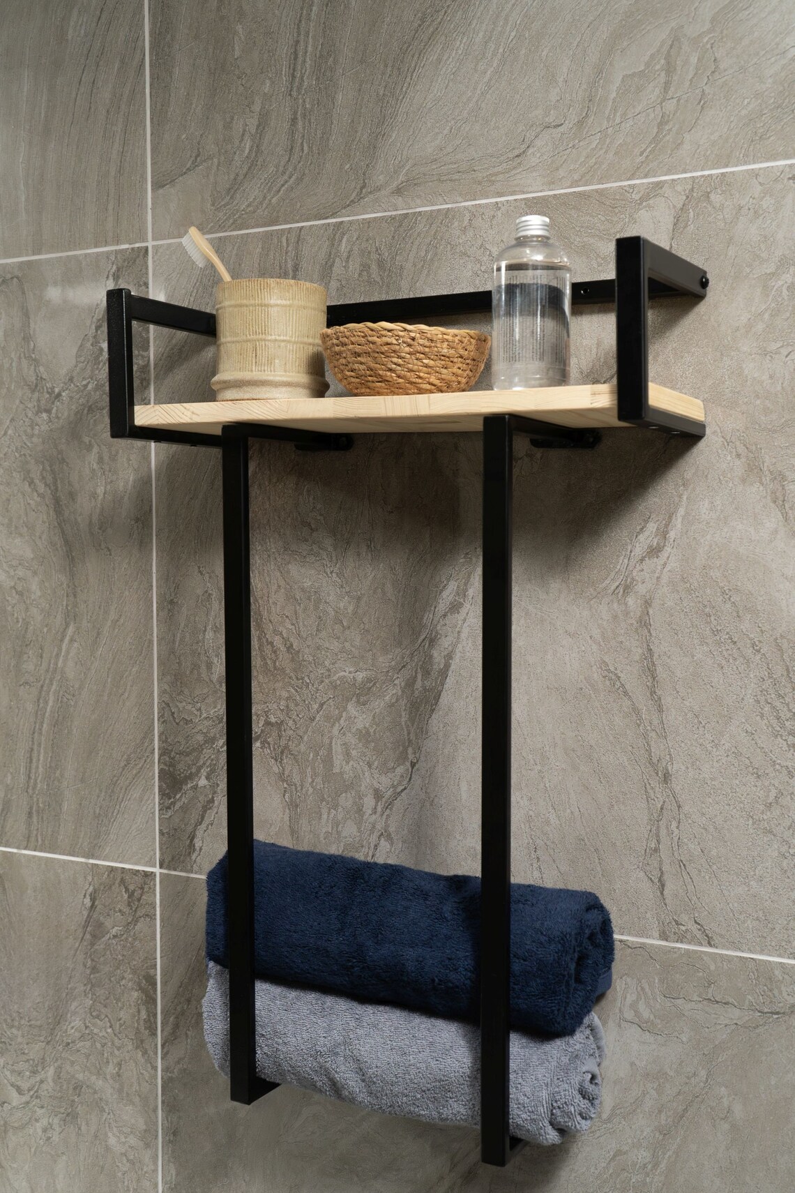 Comfork.com’un modern çizgilere sahip raflı banyo havluluk modeli, küçük ve orta ölçekli banyolarda düzeni sağlamak için tasarlandı. Üst kısmında yer alan ahşap raf sayesinde kişisel bakım ürünlerinizi, yedek havlularınızı veya dekoratif objelerinizi tek bir alanda toplayabilir, alt kısımdaki barlarda günlük havlularınızı elinizin altında tutabilirsiniz.